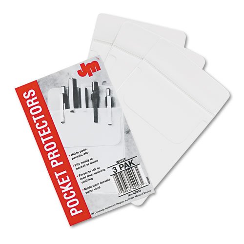 Safeguards clothes from ink leakage, pen or pencil marks and holes caused by sharp objects like scissors or utility knives. Organizes writing instruments or tools (not included). Foldover flap protects pocket edge from wear and tear caused by pen cap clips. Fits perfectly in standard shirt pockets. Global Product Type: Pocket Protectors; Color(s): White; Material(s): Grained Vinyl; Quantity: 3 per pack.